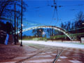 公園と自動車、トラム道の2つのレベルを人と自転車が自由に行き交うことのできるイメージそのままに、軽やかなトラスの構造体に橋面はウッドデッキ、高欄も線的な構成になっている。また、夜間はうっそうと暗い辺りの闇のなかにさりげなく浮かび上がるライトアップがなされ、長い直線的な大通りにひとつのアクセントをつけている。 |