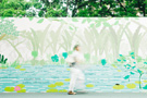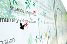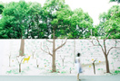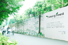 置することができる、という参加型の企画とした。用意されたシールを各自が選び、仮囲い上に配置されたキーワードの森の中、 「興味がある」「応援したい」場所を選び、そこに直接貼ってゆく。仮囲いの森の誕生から時が経つにつれ、そこには動物が育ち花や実がみのり、生態系はその姿を豊かに変化させていく。 |